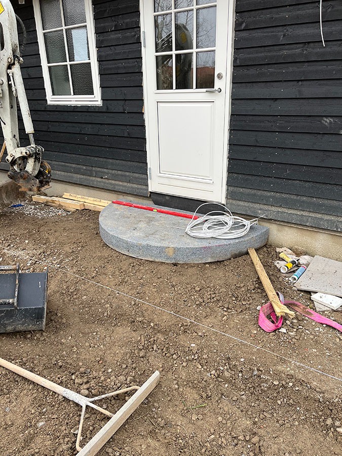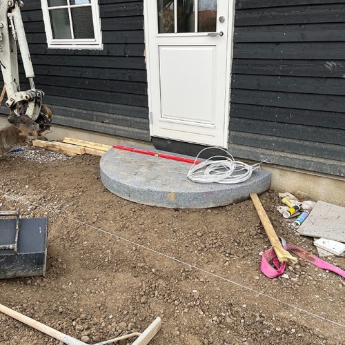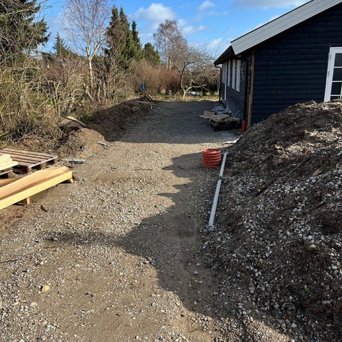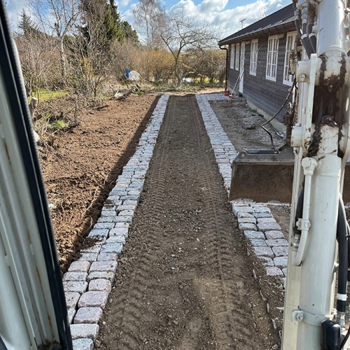 Brolægningsarbejde ved en sommerhusgrund i Rødvig Stevns, som vi selv havde fornøjelsen af at bygge et år tidligere. Traditionelle kørespor, bestående af slidte brosten, samt montering af trappe i granit.